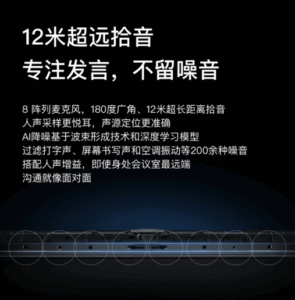 Equipped with an 8-microphone array and supporting 180° wide-angle pickup, the system captures clear audio from distances up to 12 meters, ensuring every speaker is heard clearly.